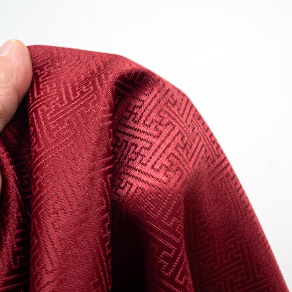 【紗綾形(さやがた)】と呼ばれるこの紋様は「卍」がななめに連なりできた紋様です。もともと「紗綾」という織物によく使われていた「卍繋ぎ」というこの紋様が生地の名前を取って【紗綾形】と呼ばれるようになりました。「卍」が絶えることなく続くことで「不断長久」の意味を持つ縁起柄です。織りで表現された紋様は光の加減で無地に見えたり浮かび上がったりと違った印象の顔を見せます。日本の伝統的な柄ですが、場所を問わずお使い頂けます。荘厳な【紺】,【えんじ】,【利休ねず】の3色ををご用意しました。生地はしっかりとした手触りで光沢のあるポリエステル素材です。