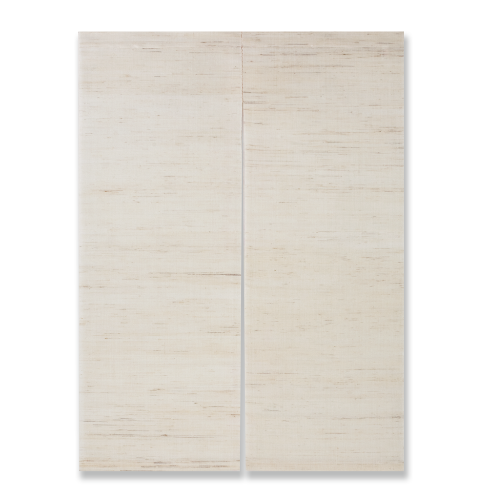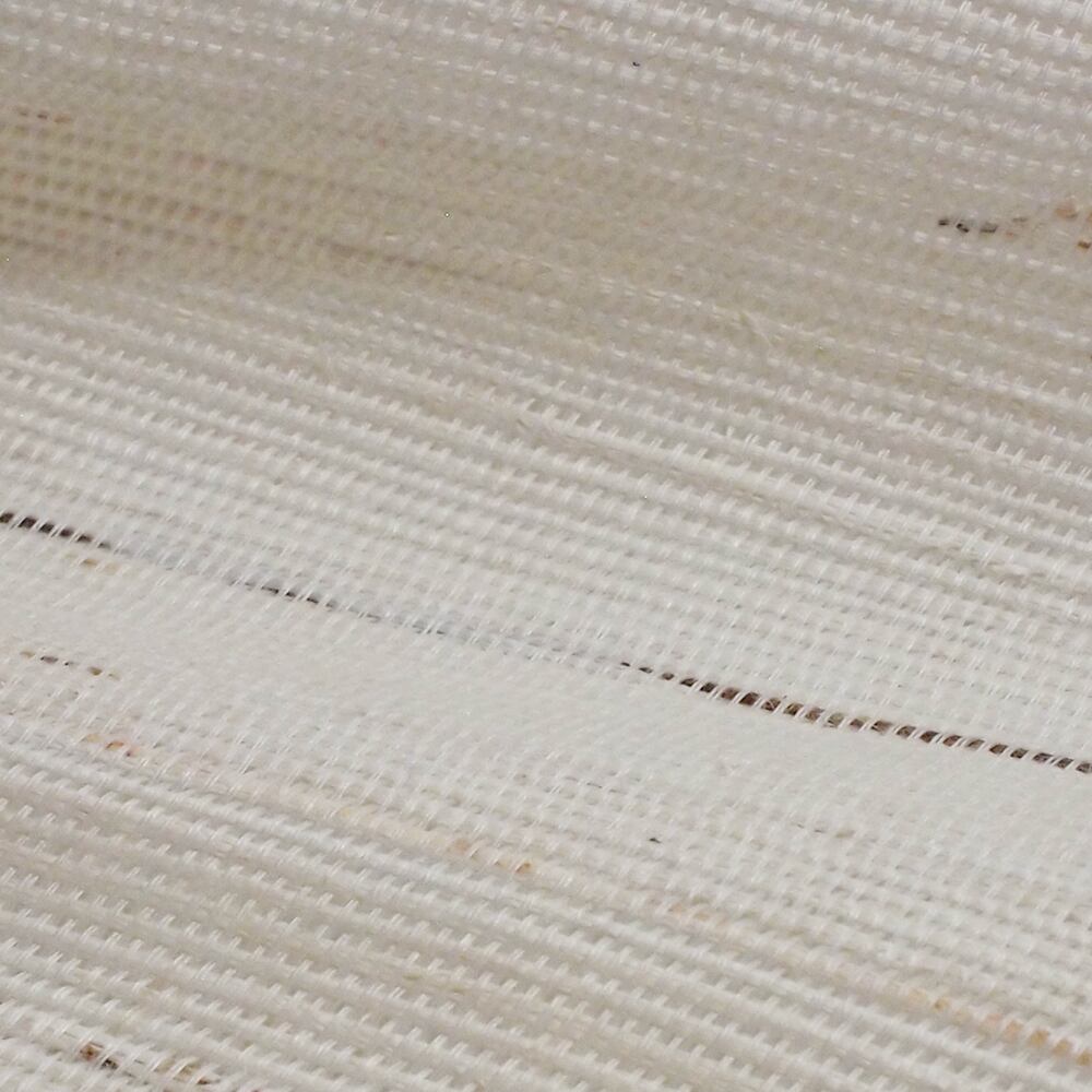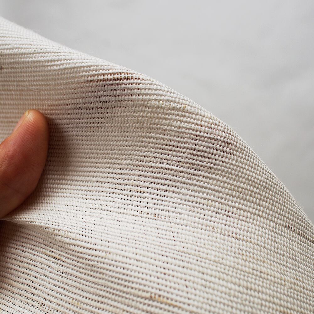 麻糸を平織にした昔ながらの生平、ちょっと太番手で織り込み、白さと上品な雰囲気の「三郎丸」。横に走る織目が特徴で、麻 100% の繊維が感じられる風合いです。霞み模様のように入る少し濃い色の線は、自然素材特有の葉や茎や実の色です。横方向はしっかりと、縦方向は 柔らかい独特の生地が見せる表情は高級感があり、優しい光沢を持つ存在感のある「のれん」です。