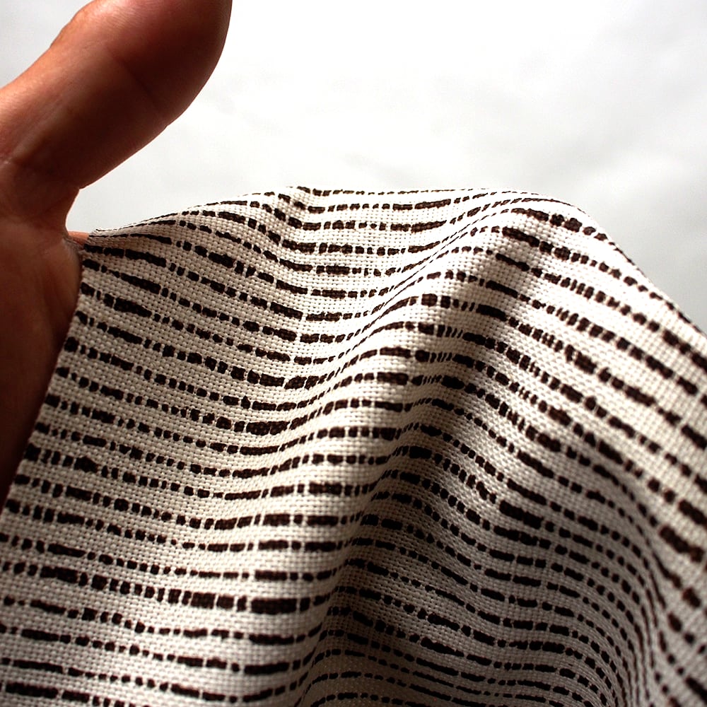 江戸時代に庶民の間で持て囃された縞模様は、南蛮貿易によって日本にもたらされました。江戸の庶民は色んな縞模様を創りだし「粋」を楽しんだそうで【千筋】よりも細い縦縞が万入ると言う意味で【万筋(まんすじ)】と名付けられました。自然な白地に筆で描いたようなとても細い焦茶の縞が入り、横糸が白く渡る事で複雑な縞模様を見せます。万筋の生地と一見無地にも見える繊細なシケ模様が入った無地おぼろ染めとの組み合わせは、シンプルモダンで和洋問わずどんな空間にも合うデザインです。無地おぼろ染め部分は【黒ねず】と【栗梅】をご用意しました。生地はざっくりとした織目で、手になじみの良い変わり織りです。