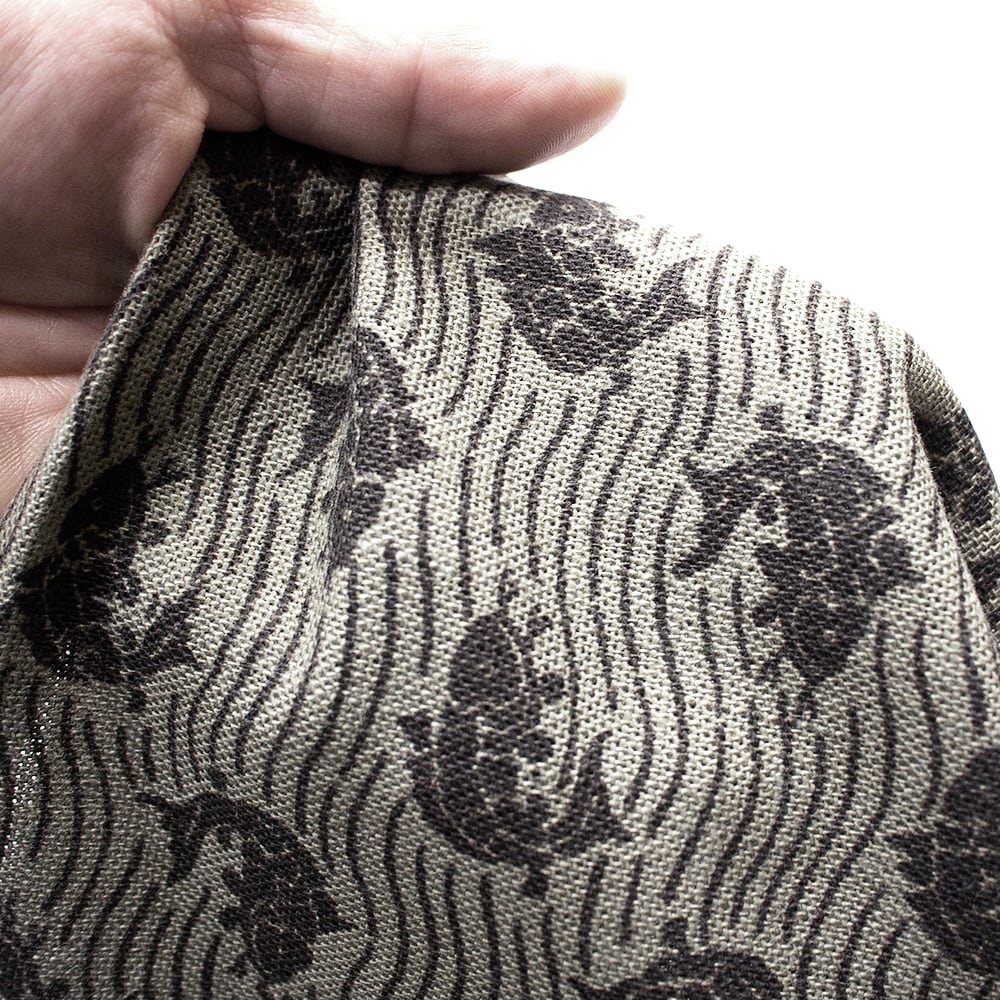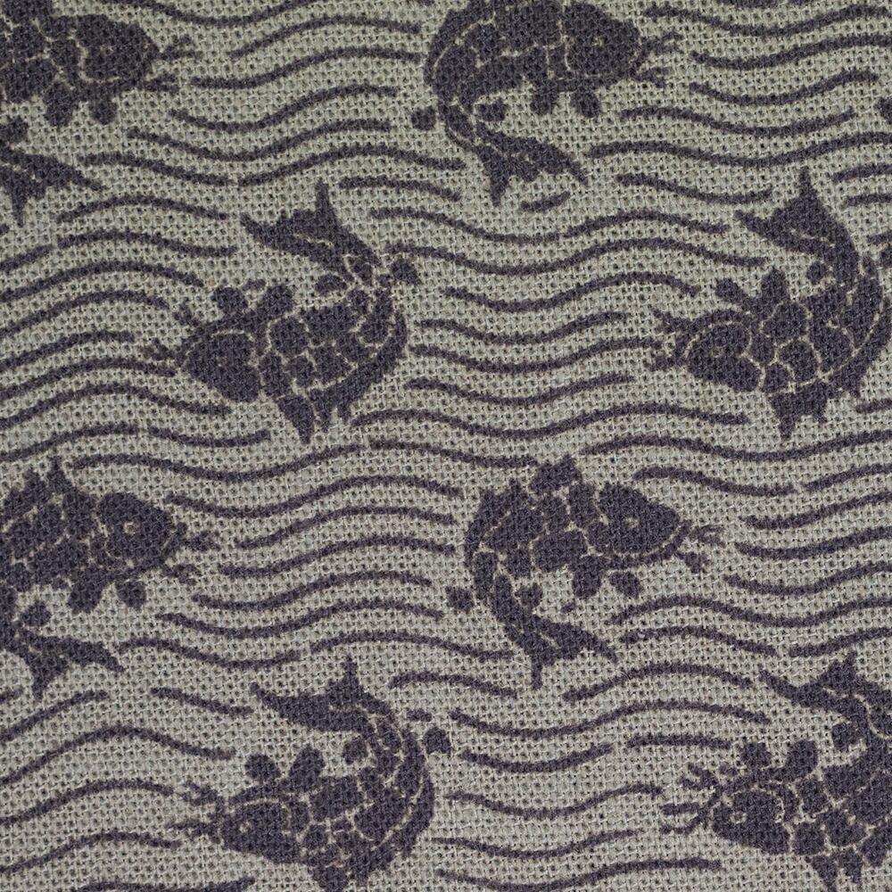 中国から「名物裂」として伝わったこの柄を日本では【荒磯】と呼びます。中国では鯉が黄河を遡り滝の上の竜門をくぐると龍にかわるとされたことから、鯉は日本でも「出世魚」の吉祥柄となりました。この柄は波間を踊るように元気に跳ねる鯉の姿を表すことで「子供の健やかな成長を願う柄」として、また出世魚から「昇進のシンボル」として使われてきました。おぼろに霞む濃淡がある事から名付けられた【おぼろ染】に【荒磯】柄を施しました。古典柄ですが古さを感じさせる事はなく、地の自然なムラ感が柔らかな風合いで場所を選ばずお使い頂ける事と思います。シックな【グレー】と【黒ねず】の2色をご用意しました。ざっくりとした織目で柔らかく手になじみの良い変わり織りです。