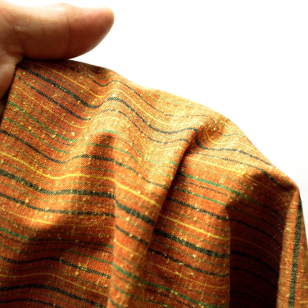 かつてインド東岸のサントメ(SanTome)から日本に入ってきた縞模様の木綿の織地を桟留縞と名付けました。その後、江戸後期に舶来の縞模様を模した木綿織物を【唐桟(とうざん)】と呼ぶようになり、幕末には大変流行したそうです。細い糸で織られた生地は洗いざらしのような自然な風合い持たせる「ワッシャー加工」を施し、糸の溜まりが表情を豊かにします。落ち着いた優しい色合いの【紺】【えんじ】【グリーン】【オレンジ】の4色をご用意しました。柔らかくとても手触りの良い布地です。