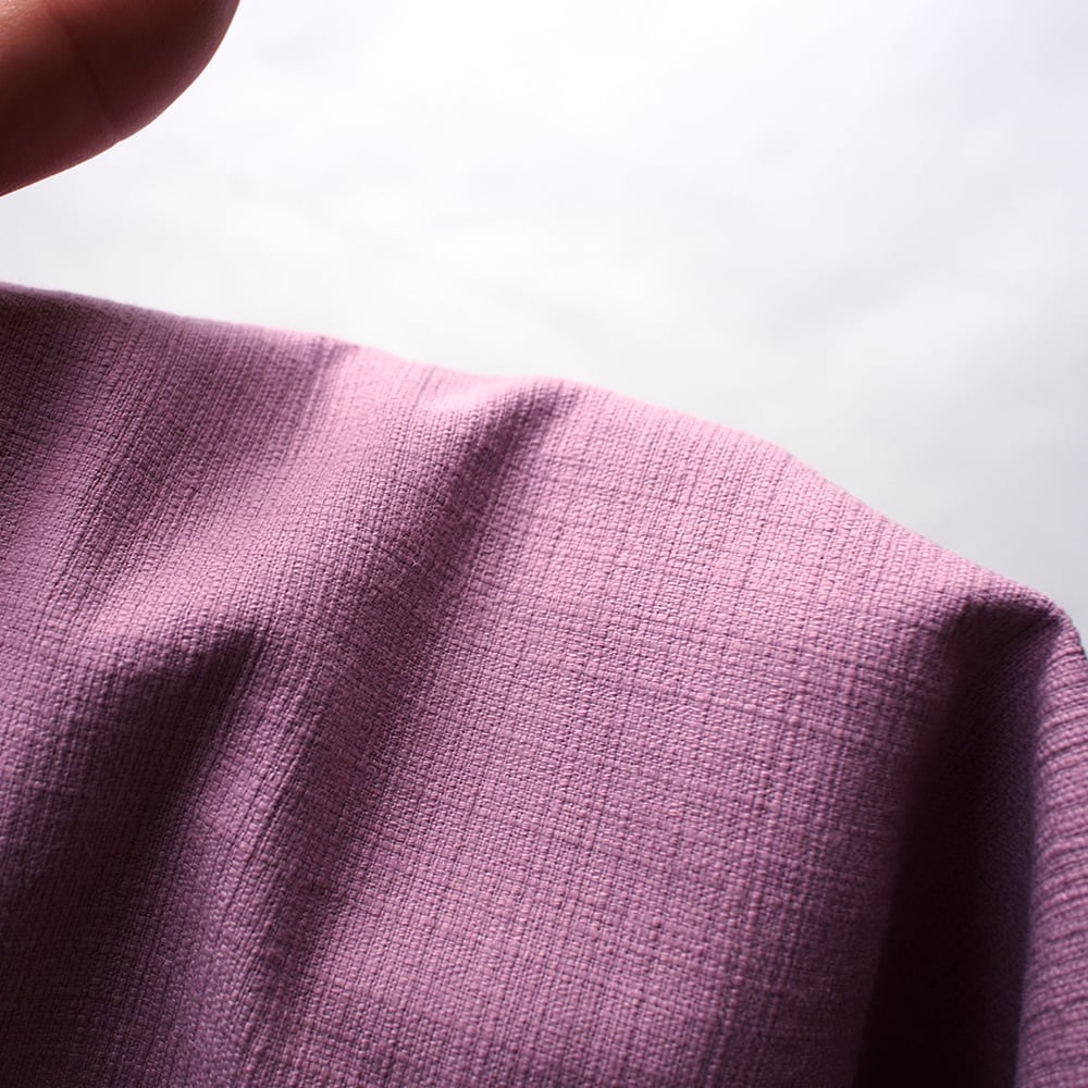四季の移ろい捉えたような日本古来の色は、風情ある自然の色を映しています。同系色の落ち着いた深い色と優しい淡い色の組み合わせのリバーシブル仕様は、その日の気分や使う場所で色を変えて頂くと普段の暮らしのスパイスとなります。心を和ませる色のバリエーションは全5種類をご用意しました。異なる太さの糸を使い平織りとなな子織りを組み合わせて織られたブッチャー生地は、交叉する糸の凹凸が染め色に陰影を落とし深みを加えます。しっかり柔らかな手触りが心地よく、無地でありながら織り糸の表情が感じられる素材です。