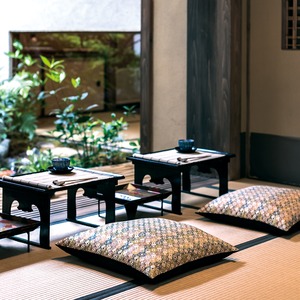 連なる円が描き出すこの紋様を【七宝】と呼びます。永遠に連鎖することで「円満、調和、縁つなぎ」など縁起の良い吉祥紋様として伝えられ、現代でも工芸や衣装、グラフィックデザインなど目にする機会が多くあります。美しい織り地は京都が誇る【西陣の紋織】で、重厚感がありしっかりとした風合いを持ち、織り模様の凹凸が感じられます。多色で織られた和色の七宝は落ち着いた色味で、七宝の中に施された細かな柄が複雑な表情を見せます。味わい深く格調高い仕上がりが雅を演出します。表側は西陣の紋織を、裏側は黒無地で作りました。