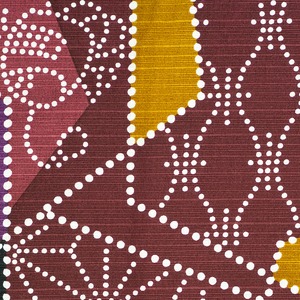重なりあった六角形に様々な吉祥紋様が見え隠れします。六角形は「亀甲」ともいい「健康長寿や金運繁栄」を願う柄として、またその中に魔除けの「麻」、運気上昇の「立涌」、未来永劫の平和と幸せを願う「青海波」などさらに縁起のよい吉祥紋様を伊勢型の錐彫(きりぼり)を模したデザインで加えています。色は落ち着いた民芸調の【黒】と【えんじ】をご用意しました。生地はサラッと優しい触り心地、ヨコ糸の太さに変化があるので味のある太細な横縞が入る特徴を持つ表情豊かなシャンタン生地です。