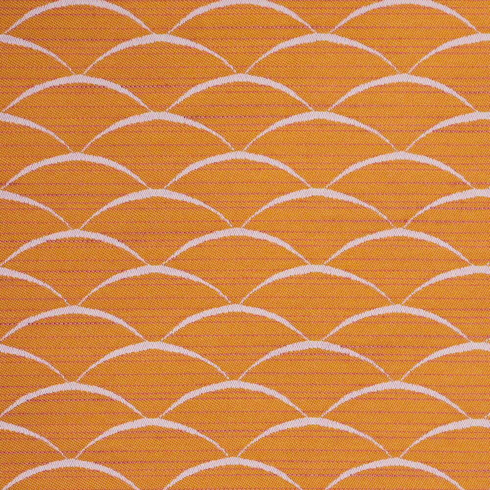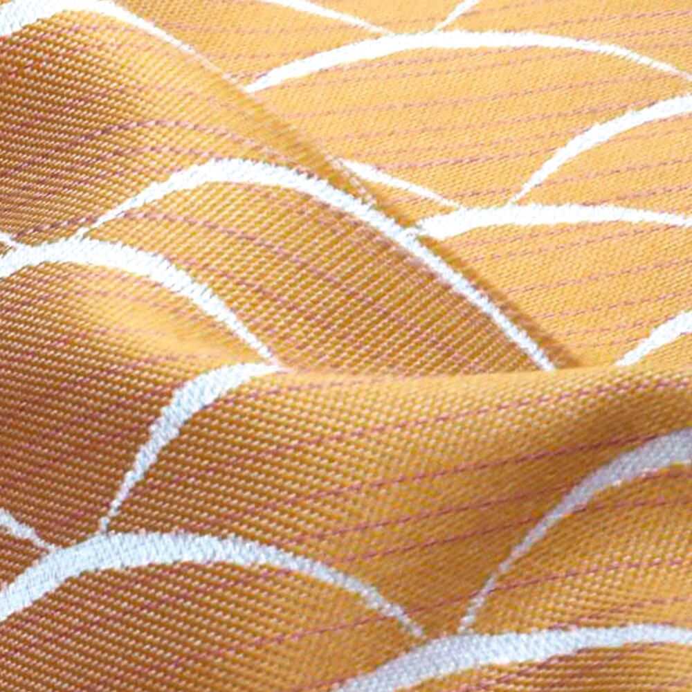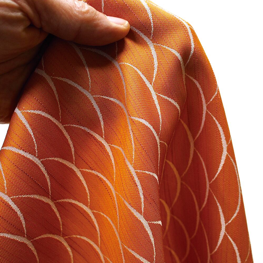 万葉集にも歌われている【露草】は「月草」や「蛍草」など多くの名前で呼ばれ、その儚さと美しさに人々は魅了されてきました。露にしなった葉が並ぶこの模様は、地紋にも使われるシンプルな紋様です。紬糸のように節のある糸を使い織ることで、ヨコ線が現れては消える複雑な織地を見せます。さらりとした手触りで柔らかく、光沢と凹凸のある生地は、ポリエステル素材のためお手入れが簡単です。静かな【利休】と夕日を映す【あかね】の2色をご用意しました。シンプルモダンな【露草】模様はお部屋にしっとりとした雰囲気を加えます。