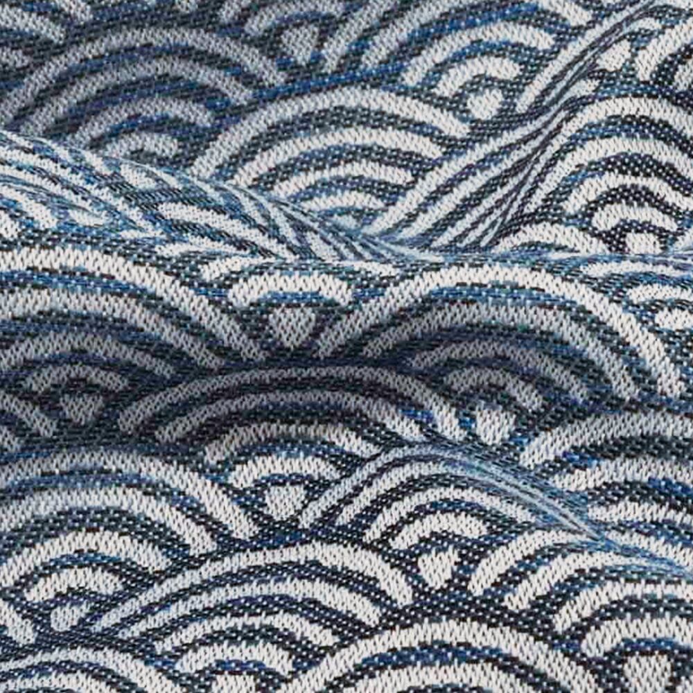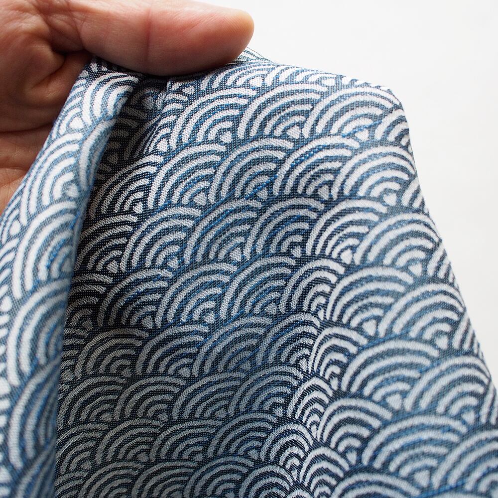 同心円を互い違いに重ねた波模様の一つで、穏やかな波が果てる事なく続くのを表現しています。この伝統模様の【青海波】は、サザン朝ペルシャで生まれシルクロードを経て中国から飛鳥時代に日本へ伝わったと言われています。広い海原に続く波は、「未来永劫の平和と幸せ」を願う吉祥紋様で衣装だけでなく陶器・蒔絵など工芸にも多く使われて来ました。生地は紬糸のように節のある糸を使い織ることで、ヨコ線が現れては消える複雑な織地を見せます。爽やかな【紺】と柔らかな【かれ茶】の2色をご用意しました。ざっくりとした手触りですが柔らかく、ポリエステル素材のためお手入れが簡単です。。