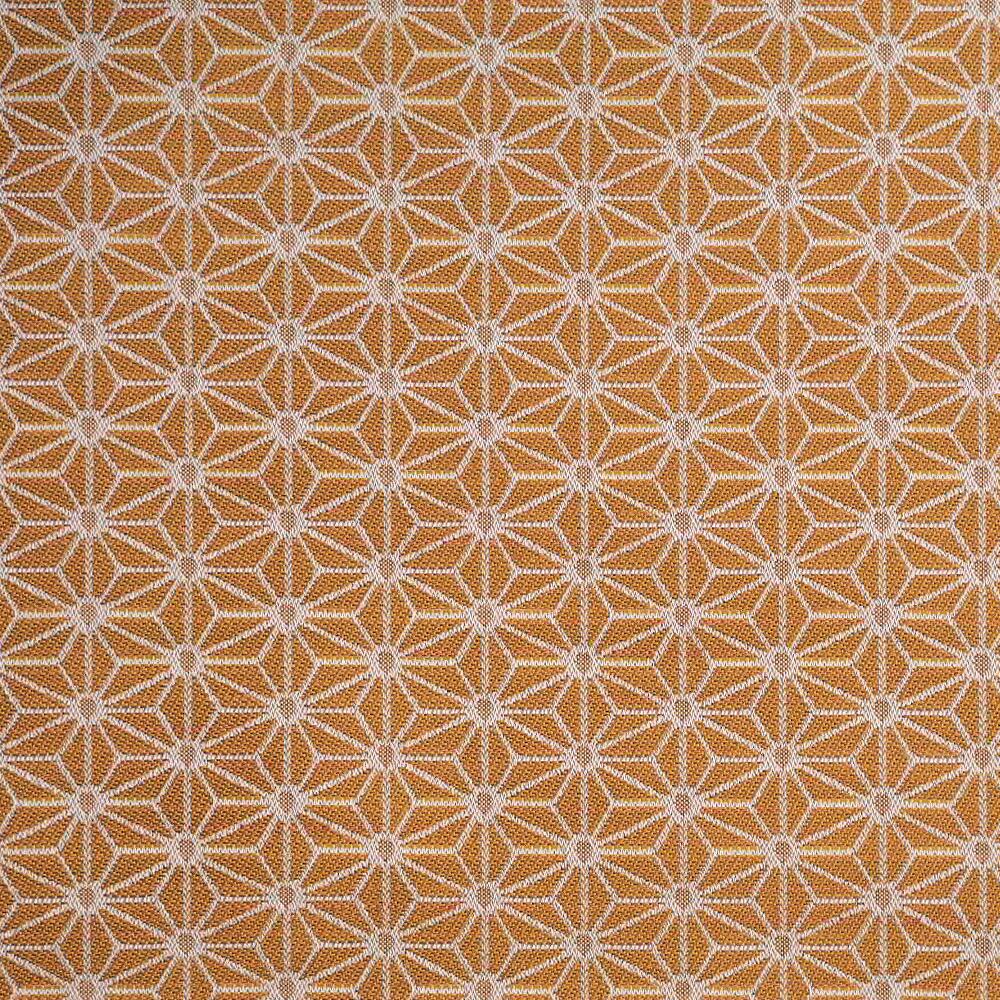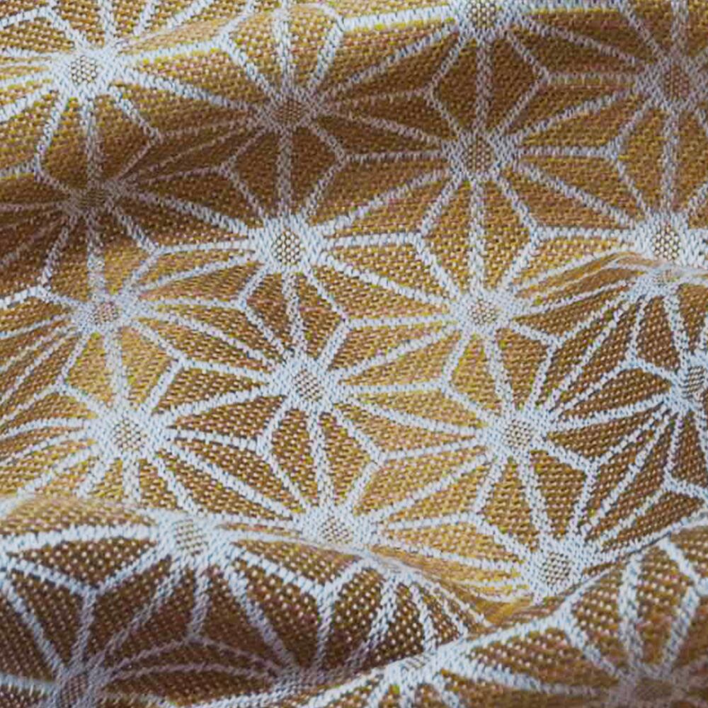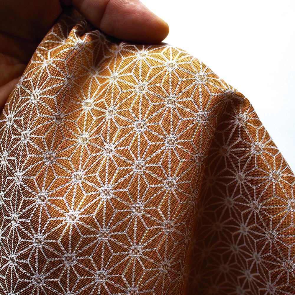 平安時代に仏像の衣服図柄として截金細工などで【麻小紋】が使われ、次第に普及し江戸時代には着物の流行図柄となりました。麻は成長が早くまっすぐに伸び、病害虫に強いことから、子供の「健やかな成長」を願い、また「魔除け」の模様として使われました。和柄の中でもポピュラーなこの柄は、その可愛さに現代では大人にも人気があります。生地は紬糸のように節のある糸を使い織ることでヨコ線が現れては消える複雑な織地を見せ、光の加減で地色が変化します。シックな【えんじ】と【金茶】の2色をご用意しました。さらっとした手触りで柔らかくポリエステル素材のためお手入れが簡単です。幾何学模様の【麻小紋】は、和洋どちらの空間にも馴染みます。